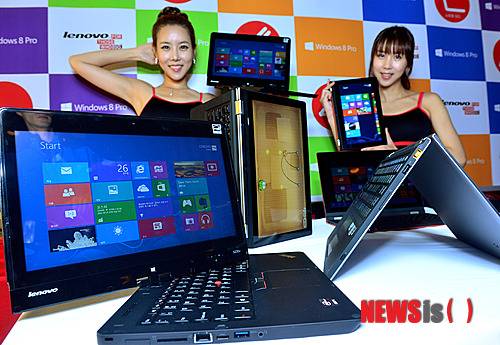 【서울=뉴시스】최동준 기자 = 레노버가 26일 오전 서울 신문로 라운지바에서 윈도 8에 최적화된 4가지 모드의 컨버터블 제품을 선보이고 있다. 이번 컨버터블 제품은 업계에서 유일하게 360도로 젖혀져 아주 간단히 노트북에서 태블릿으로 바꿀 수 있는 아이디어패드 요가 13과 뛰어난 성능으로 울트라북으로 활용되는 동시에 상단 부분을 비틀어 컨버터블 태블릿으로 전환이 가능한 씽크패드 트위스트다.