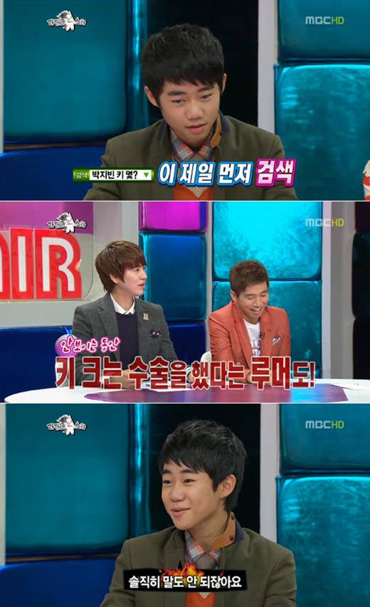 이날 방송에서 MC 윤종신은 "인터넷에 박지빈을 치면 '박지빈 키 몇?'이 제일 먼저 검색된다"며 "쉬는 동안 키 크는 수술을 받았다는 루머가 있다"라고 입을 열자, 박지빈은 "말도 안 되는 루머다. 키 크는 수술을 어떻게 하느냐"라며 당혹감을 드러냈다.
