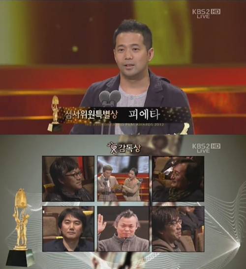'피에타'는 이날 대종상영화제 시상식에서 여우주연상(조민수), 심사위원특별상(김기덕) 단 2개부문 수상에 그쳤다.(사진=KBS 2TV '대종상영화제' 캡처, 뉴스엔DB)