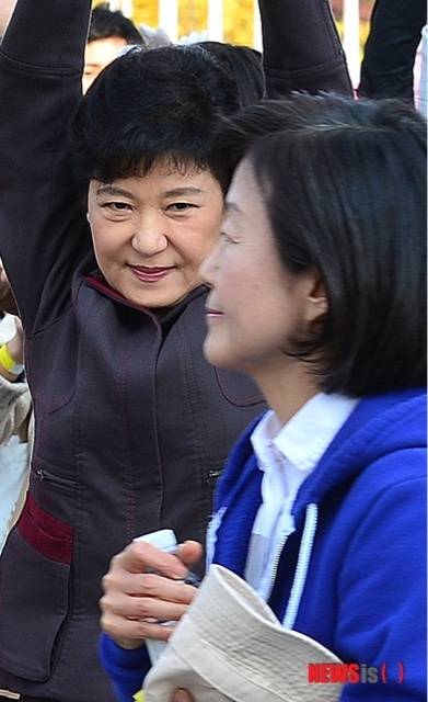 <뉴시스>는 지난달 28일 서울 송파구 올림픽공원에서 열린 '위드베이비 유모차 걷기대회'에서 박 후보가 안 후보 부인인 김미경 서울대 교수를 바라보는 사진을 찍어 인터넷에 올렸다. 사진 속 박 후보는 준비운동을 하면서 앞을 지나가는 김 교수를 뚫어지게 바라보고 있다. 그런데 이 사진은 곧 <뉴시스> 홈페이지에서 사라졌고, 검색도 되지 않았다. 5일 현재 <뉴시스>가 언론사 등을 상대로 유료로 제공하는 사진 검색 사이트에선 해당 사진들이 검색은 되지만 확대하거나 내려받기를 시도하면 "정책에 의해 삭제된 기사"라는 알림창만 뜰 뿐 내려 받기가 되지 않는다.