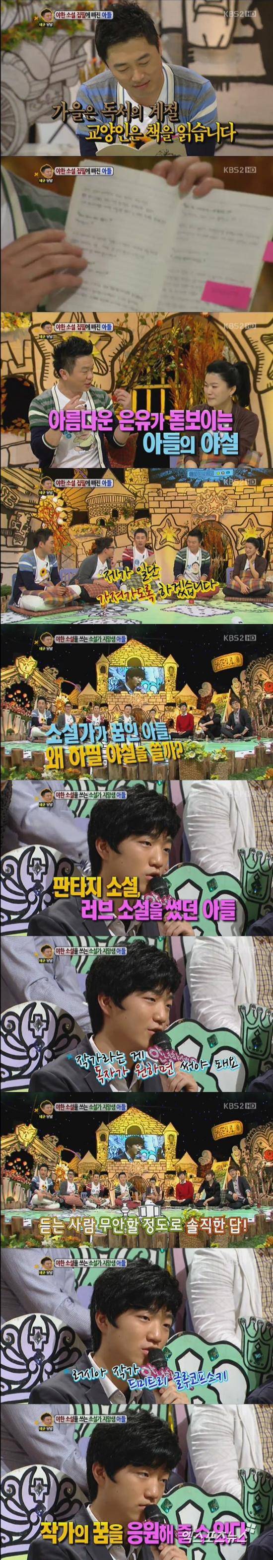 스튜디오에 등장한 야설 작가 아들은 "대강 열편 정도 썼다. 중학교 1학년 때 부터 소설가가 꿈이였다. 친구들이 너 이런거 쓰면 좋을 것 같다고 해서 쓰시 시작했다"고 설명했다.