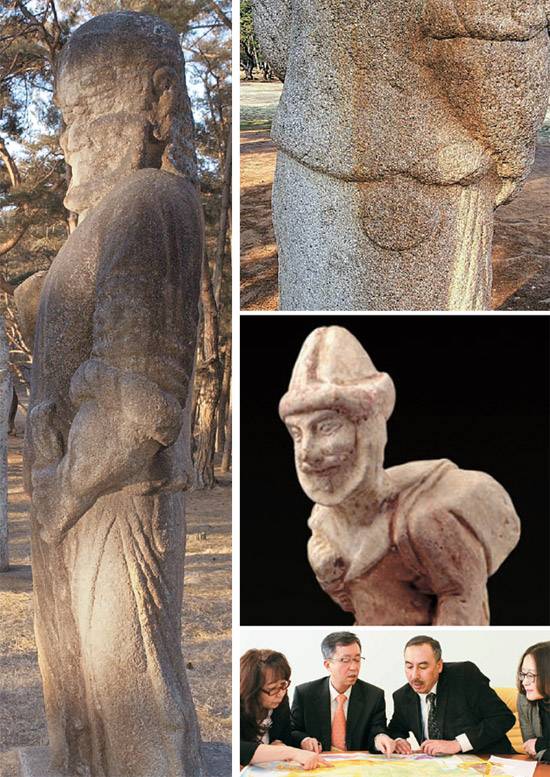 통일신라 8세기경 제작된 경주 괘릉의 무인석상. 연세대 지배선 교수는 "얼굴은 서역인이고 의상은 소그디아 스타일"이라고 말했다(왼쪽 긴 사진). [중앙포토] 흥덕왕릉 무인석상의 뒷모습. 오른쪽에 보이는 작은 뒷주머니는 '포체테'라 불리는 전형적인 소그디아 스타일이라고 지 교수는 말한다(오른쪽 가장 위). 행낭을 지고 여행하는 소그디아 사람의 인형. 7세기경 제작된 것으로 추정된다. 중국국가박물관 소장(오른쪽 가운데). [사진 국립중앙박물관] 역사학자들이 긴급 대담을 했다. 왼쪽부터 코지로바 카자흐스탄 유라시아 대학 교수, 지배선 연세대 명예교수, 알리세프 우즈베키스탄 고등교육부 산하역사연구소 위원, 미나라 키르키즈 한국대학 교수(오른쪽 가장 아래).