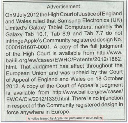 [아시아경제 권해영 기자] "법원의 판결에 따라 애플이 광고합니다." 애플이 영국 홈페이지에 이어 신문 지면에도 2차 사과문을 게재했다. 이번에는 '애플이 직접 사과를 한다'는 내용의 문구가 추가됐다. 홈페이지에 이어 신문 지면에까지 제 돈을 들여 두 차례나 삼성전자에 사과 광고를 하는 등 애플의 수난이 끊이지 않고 있다. 6일 업계에 따르면 애플은 영국 언론 가디언과 데일리메일 11월5일자에 삼성-애플 소송과 관련해 사과문을 게재했다. 지난 3일에 이어 두번째로 법원의 명령에 따른 것이다. 법원은 갤럭시탭은 아이패드 디자인을 베끼지 않았다는 판결 내용을 애플이 직접 설명한다는 내용을 독자들에게 공지해야 한다고 명령했다. 애플은 앞서 지면에 게재한 1차 사과문에서는 판결 내용만 언급했다. 애플이 사과문을 올렸다는 사실은 언급하지 않았다. 사정을 모르는 독자는 광고 주체가 애플인지 삼성인지 알 길이 없었다. 하지만 이번 2차 사과문에서는 하단에 "법원 판결에 따라 애플이 하는 광고입니다(A notice issued by Apple Inc. pursuant to court ruling)"라는 문구를 추가했다. 광고 내용은 법원이 구체적으로 정해준 내용 그대로다. 애플이 두 번씩 사과문을 게재하는 등 굴욕을 당하는 것은 '꼼수 사과'를 통해 법원을 자극했기 때문이다. 앞서 애플은 홈페이지에 사과문을 올리며 영국과는 달리 독일 법원, 미국 배심원은 애플의 손을 들어줬다고 밝혀 영국 법원을 격노하게 만들었다. 애플이 앞으로 지면 광고를 통해 사과문을 게재해야 할 매체는 모바일매거진, T3매거진 등 2곳이다. 한편 애플은 사과문 꼼수에 이어 '스크롤 꼼수'로 또 다시 도마에 올랐다. 영국 홈페이지에 2차 사과문을 올리면서 기존 홈페이지 디자인을 바꿔 스크롤을 내려야 사과문이 보이게 한 것이다. 첫 화면에 접속한 상태에서는 사과문이 있는지조차 알 수가 없다. 이에 따라 법원이 애플을 상대로 또 다시 제재에 나설 지 주목된다. [모바일] 더욱 빠르고 편리하게 만나는 실시간 모바일 뉴스[루머 & 진실] 증권시장에서 떠도는 루머를 파헤쳐드립니다