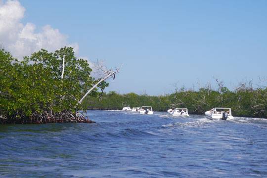 칸쿤의 에메랄드빛 바다는 연중 수온이 25도 이상이어서 항상 따뜻한 느낌이다. 스쿠버 다이빙, 정글 투어, 제트 스키, 패러세일 등 다양한 해양 스포츠를 즐길 수 있다. 가장 인기 있는 것 중 하나가 정글 투어다. 라군에서 2인용 모터보트를 타고 아열대 지역에서 자라는 맹그로브 숲을 지나 카리브해로 진출해 스노클링을 즐기는 프로그램이다. 왕복 40여분 동안 모터보트를 직접 운전하는 쾌감을 맛볼 수 있다. 스노클링을 하면서 화려한 열대어와 산호를 기대했는데, 바닷속이 많이 훼손된 듯한 모습이어서 실망했다. 2005년 허리케인 윌마가 지나간 이후 이렇게 변했다고 한다.