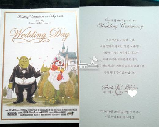 "조금 모자라도 착한 사람 사랑 앞에서 바보인 키 큰 노총각이 세상에서 제일 아름다운 니모와 진짜 사랑을 시작하려 합니다. 부디 참석하시어 기쁨의 자리를 축복으로 더욱 빛내 주시길 바랍니다."
