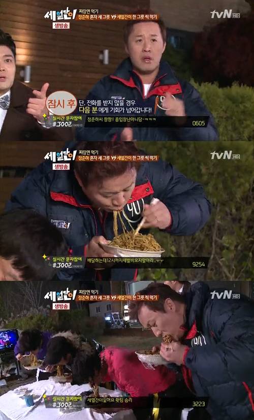 정준하는 지난 11일 방송된 케이블채널 tvN '세얼간이'에 출연해 개그맨 이수근, 가수 은지원, 김종민과 함께 짜장면 빨리 먹기 대결을 펼쳤다.