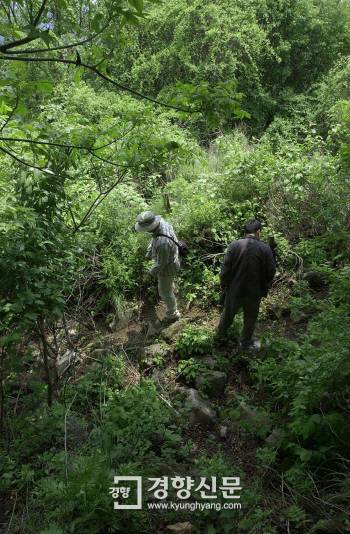 비무장지대 일원 유적에 밝은 이우형씨와 함께 성산성 답사를 위해 미확인 지뢰지대를 통과하는 필자. 성산성 조사를 위해 지뢰탐사대까지 운용됐다.