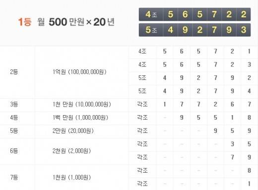 일시불로 지급되는 2등은 1등 앞, 뒤 번호로 4조 565721, 4조 565723과 5조 492792, 5조 492794, 3등 각조 177267, 4등 각조 95518, 5등 각조 959, 6등 각조 35, 각조 79, 7등 각조 8, 각조 1로 정해졌다.