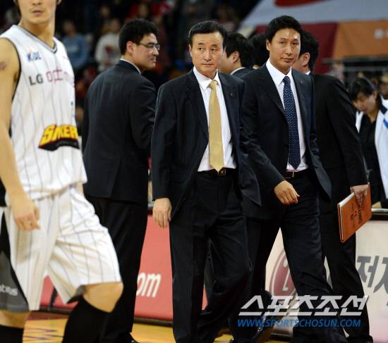 서울SK와 창원LG의 2012-2013 프로농구 경기가 25일 잠실학생체육관에서 열렸다. LG 김진 감독이 SK에 83대61로 패한 후 아쉬운 표정으로 코트를 빠져나가고 있다.