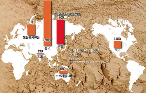 이처럼 희토류 원소를 포함한 광물질의 양이 약 10억t에 이른다는 것이다. 그리고 그 안에 포함된 희토류 성분 원소의 양이 약 4800만t이다. 이것은 어느 정도 규모일까. 미국 국가지질국의 2009년 자료에 따르면(왼쪽 표 참조) 희토류 매장량은 세계 1위인 중국이 8900만t, 그다음인 독립국가연합이 2100만t, 그다음 미국이 1400만t으로 돼 있다. 그리고 중국이 희토류를 전략 자원화하는 바람에 일본이 대체 구입처로 정한 인도는 고작 130만t으로 돼 있다. 따라서 합영투자위원회 자료가 사실이라면 북한 희토류 매장량 4800만t은 명실공히 세계 2위에 해당하는 것이다.