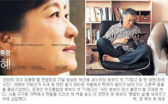 18대 대선 '이미지 전쟁'의 막이 올랐다. TV광고 속 후보의 이미지 하나, 또 가슴을 울리는 찬조연설 한 대목이 누구를 찍을지 망설이고 있는 유권자의 마음을 움직일 수 있다. 새누리당 박근혜, 민주통합당 문재인 후보 캠프가 '후보의 진정성을 세련된 감각으로 전달하라'는 특명을 안고 TV광고와 선거 로고송 등에 각별히 정성을 쏟고 있는 이유다.