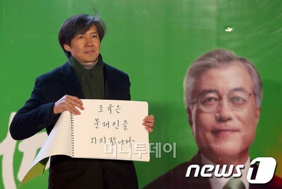 이어 무대에 오른 조국 서울대 법학전문대학 교수는 영화 '러브액츄얼리' 속 스케치북 프로포즈를 패러디하며 문 후보에 대한 지지를 선언했다. 그는 "조국은 문재인을 지지한다"며 "'정글'이 된 대한민국을 바꿀 수 있는 의지와 능력을 갖추었기 때문이다"라고 말했다.
