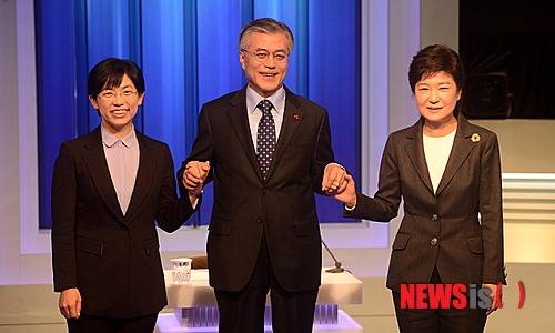 【서울=뉴시스】김민자 기자 = 민주통합당 문재인 대선후보와 통합진보당 이정희 대선후보는 4일 오후 중앙선거방송토론위원회 주최 첫 대선후보 토론회에서 '친인척 비리' 문제를 놓고 새누리당 박근혜 후보를 향해 십자포화를 쏟아부었다.