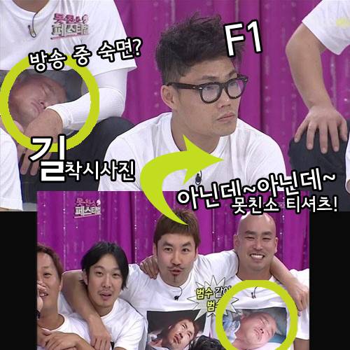 해당 사진은 지난 1일 방송된 MBC <무한도전-못친소 페스티벌>의 한 장면을 캡처한 것으로 가수 김범수 뒤 누군가의 허벅지를 베고 자고 있는 것처럼 보인다. 하지만 자세히 보면 하얀색 티셔츠에 프린트된 사진으로, 길처럼 보이는 다른 남성의 얼굴이다.