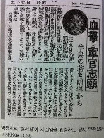 1939년 3월 31일자 만주신문에 실린 기사였다. 박정희 '혈서'에 대한 기사 제목은 '혈서 군관지원(血書 軍官志願)'으로 내용은 다음과 같다.