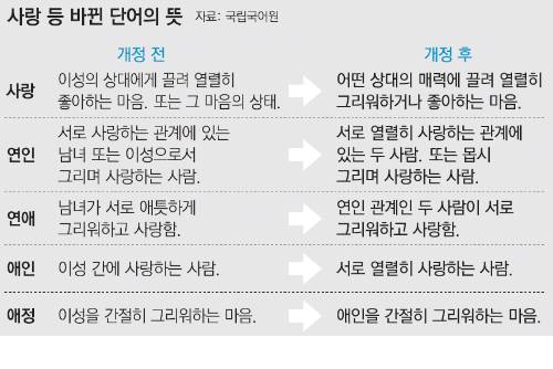 국립국어원은 지난달 7일 표준국어대사전(웹사전)에서 연인의 뜻을 '서로 열렬히 사랑하는 관계에 있는 남녀'에서 '∼두 사람'으로 바꿨다. '남녀'라는 표현 대신 동성애자 등 성적 소수자들까지 포함할 수 있는 '두 사람'이란 표현으로 개정한 것이다. 또 '이성의 상대에게 끌려 열렬히 좋아하는 마음'이란 '사랑'의 뜻풀이도 '어떤 상대의 매력에 끌려 열렬히 그리워하거나 좋아하는 마음'으로 바꾸었다.