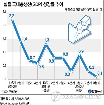 한국은행이 6일 내놓은 `2012년 3분기 국민소득(잠정)'을 보면 3분기 실질 국내총생산(GDP) 성장률은 전분기대비 0.1% 증가하는데 그쳤다.