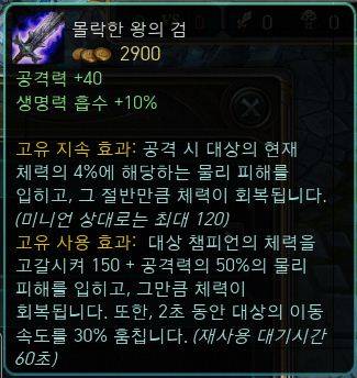 '몰락한 왕의 검'은 갱플링크, 레넥톤 등 공격과 방어를 동시에 맡는 이른바 딜탱형 챔피언이 주로 사용하는 '발지워터의 해적검'의 상위 아이템이다. 공격 시 현재 체력의 4%에 해당하는 물리 피해를 입히고 그 절반만큼의 체력을 회복할 수 있으며, 2초 동안 대상의 이동속도 30%를 낮추는 효과가 있는 것이 특징이다.