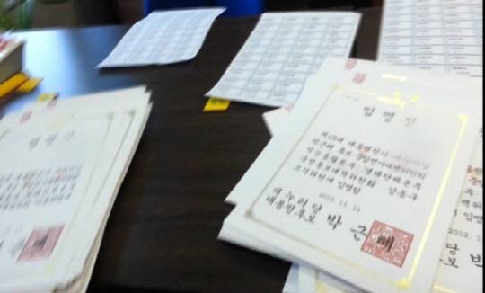 서울시선관위 직원들이 13일 새누리당 박근혜 대선 후보 측을 위해 불법적 인터넷 선거운동을 한 의혹을 받는 서울 여의도 오피스텔을 급습한 사무실에 박 후보 명의의 임명장들이 놓여 있다. | KBS < 뉴스9 > 방송 화면 캡처