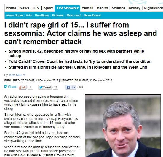 한편 영국 일간지 데일리 메일에 따르면 15세 소녀를 성폭행한 혐의로 체포된 사이먼 모리스는 성폭행 사실을 부인했지만 DNA조사 결과 범행 사실이 드러나자 "자다가 한일이라서 모른다"고 주장했다. "사건 당시 나는 잠들어 있었고, 성폭행 사실을 기억하지 못한다"는 것.