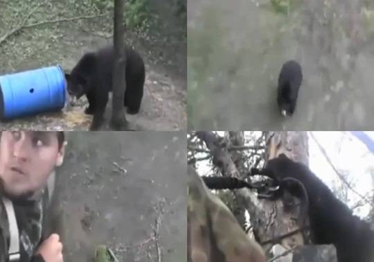 하지만 곰은 자신을 촬영하는 인기척을 눈치 채고 갑자기 쏜살같이 달리기 시작한다. 불과 몇 초 만에 카메라 앵글에서 사라진 곰은 어느 틈에 나무를 타고 남자 곁으로 다가와 있다.