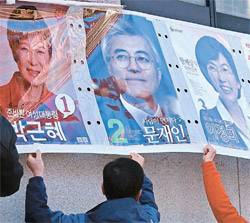 부산시 수정동 주민센터 직원들이 20일 오후 대통령선거 벽보를 철거하고 있다. [부산=송봉근 기자]통합진보당 이정희 전 후보의 막판 사퇴가 민주통합당 문재인 후보에게 '득보다 실'이 됐다는 분석이 정치권에서 나오고 있다. 종북 논란을 일으킨 이 전 후보의 '지지율 1%(약 30만 표)'가 '+α'가 되기보다 오히려 문 후보에 대한 노년층의 부담감을 늘리고 박근혜 대통령 당선인을 지지하는 보수층 결집만 불러왔다는 얘기다.