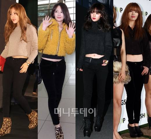 여자 연예인들은 다리를 길어보이기 위해 짧은 핫팬츠나 미니스커트를 선택했다. 몸에 비해 다리가 짧은 편이라면 하이웨스트 하의를 착용해 착시효과를 나타내보자. 다리가 마른 편이라면 상의를 바깥으로 꺼내 입되 하의를 가리지 않는 길이를 선택하는 것이 좋다. 반면 다리가 통통한 편이라면 허리를 강조하는 페플럼 디자인의 상의를 선택하고 체형을 보완할 수 있다.