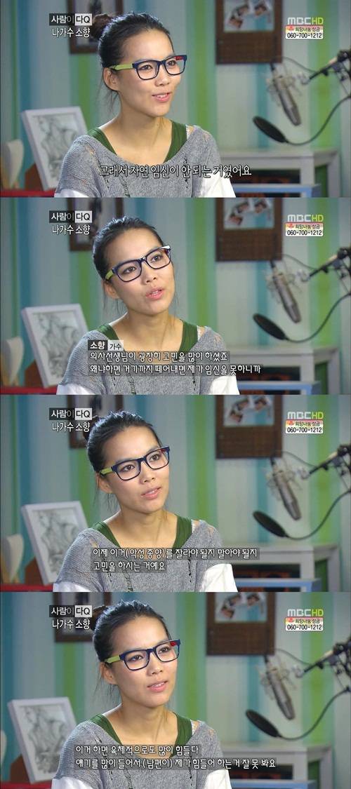 가수 소향은 29일 방송된 MBC '사람이다Q'에서 15년 전 결혼 초에 자궁암 수술을 받은 이야기를 꺼냈다.
