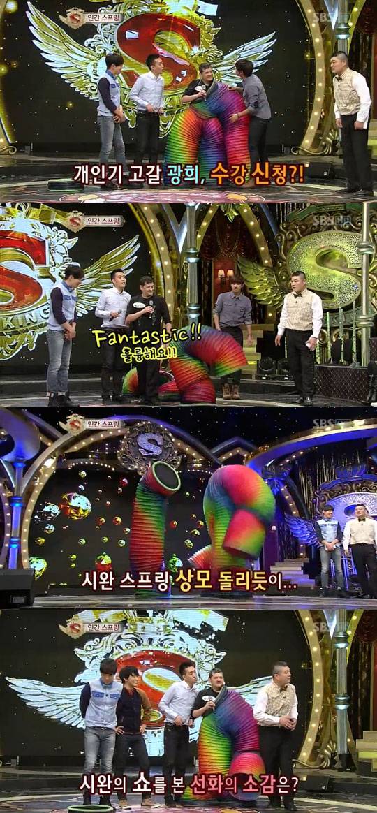 이날 스타킹에는 스프링 쇼을 선보이는 베니아민이 출연해 놀라운 스프링쇼를 선보였다. 이에 광희가 도전했지만 큰 웃음만 선사하고 말았다.