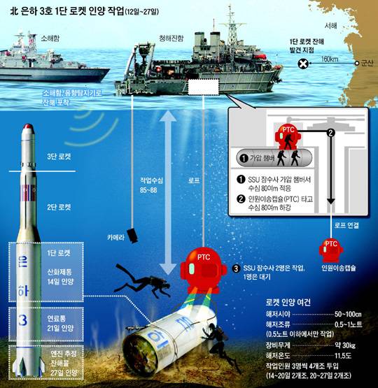 해군 관계자는 "은하 3호의 1단 로켓 잔해물 인양 작전은 최악의 조건에서 진행됐다"며 "1단 로켓의 거의 모든 부분을 수거한 것은 세계 최고 수준의 SSU(해난구조대)와 탐지·인양 기술이 없었다면 불가능했다"고 말했다.