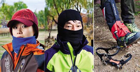 ↑ [월간산]귀를 덮어주는 겨울 모자와 버프를 착용해 열손실을 최소화했다. / 겨울 산행에서 유용하게 쓰이는 발라클라바. / 설산 산행의 기본 장비인 스패츠와 아이젠. |