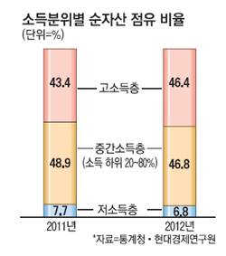 1일 매일경제가 통계청의 가계금융자료를 분석한 결과에 따르면 중산층(소득 하위 20~80% 가구)이 보유하고 있는 순자산(자산에서 부채를 뺀 숫자)이 전체에서 차지하는 비중은 2011년 48.9%에서 2012년 46.8%로 급감했다.