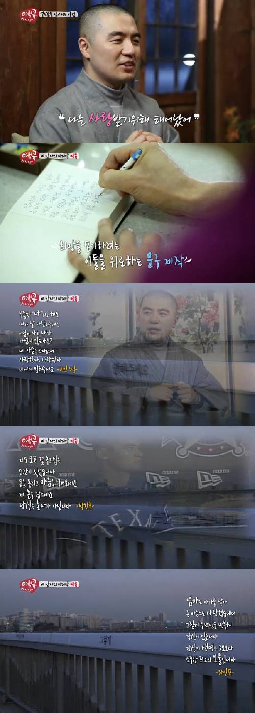 혜민스님은 우리나라가 8년째 OECD 국가 중 자살률 1위인 것을 언급하며 "한 독자가 찾아와서 스스로를 아끼고 사랑하는 마음이 없었는데 그런 마음이 생겼고 스스로를 다른 사람의 시선에 열등감만 가지고 산 게 아닌가. 후회하며 자살을 포기했다는 말을 했다"고 전했다.