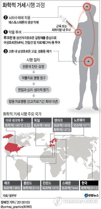◇화학적 거세법 적용 앞으로 늘어날 듯 = 화학적 거세 관련 법안은 새누리당(당시 한나라당) 박민식 의원이 지난 2008년 발의한 '상습적 아동 성폭력범의 예방 및 치료에 관한 법률안'이 근간이다.