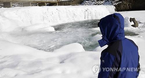 한파로 '한국의 나이애가라 폭포'로 불리는 한탄강의 직탕폭포는 거대한 빙벽으로 변했다.