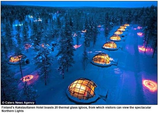 북유럽의 아름다운 밤 하늘을 마음껏 볼 수 있도록 유리로 지어진 이글루도 있다. 핀란드 우르호 케코넨 국립공원 근처의 광야에 위치한 '칵슬라우타넨(Kakslauttanen)' 호텔은 극지방에서만 나타나는 오로라를 볼 수 있는 곳이다.