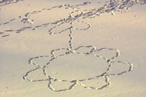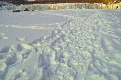| ▲ 폭포 밑 언 강에는 '꽃' '하트' '사랑해' 등 눈위에 새겨 놓은 발자국이 애틋한 사연이 새겨져 있다. |