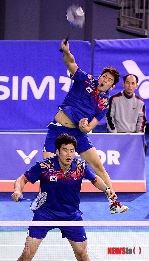 【서울=뉴시스】전신 기자 = 9일 서울 송파구 방이동 SK올림픽핸드볼경기장에서 열린 2013 빅터 코리아오픈 배드민턴 대회 남자복식 고성현-이용대와 로버트 블레어-탄빈셴 32강 경기에서 이용대가 공격을 시도하고 있다. 결과는 고성현-이용대가 세트 스코어 2-0 승리.