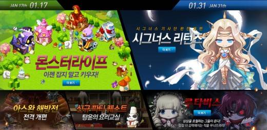 한편 오는 31일에는 기존 '시그너스 기사단'의 콘텐츠가 전면 개편되는 '시그너스 리턴즈' 업데이트를 실시한다. 1차적으로 '스트라이커' 직업의 최고 레벨을 200으로 확장하고, '하이퍼 스킬'을 비롯한 전반적인 스킬체계를 업그레이드한다. 2월 중에는 '윈드브레이커' 직업의 개편이 진행하며, 나머지 시그너스 기사단 캐릭터들도 차례로 개편할 예정이다.