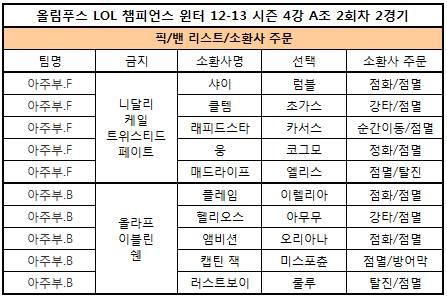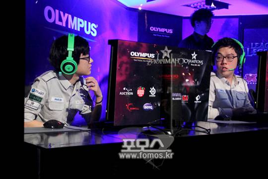 아주부 프로스트가 11일, 용산 e스포츠 상설 경기장에서 진행된 올림푸스 리그오브레전드 챔피언스 윈터 12-13시즌 4강 A조 2회차 2경기에서 아주부 블레이즈를 잡고 힘의 균형을 맞췄다.