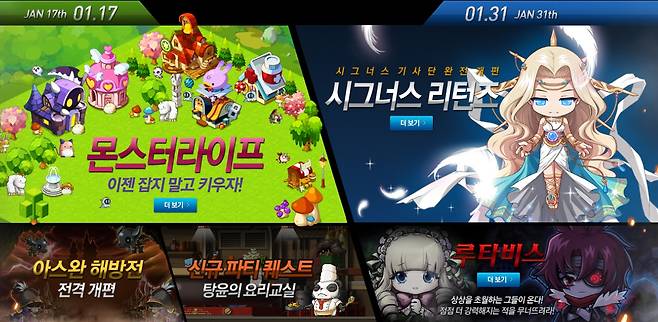 오는 31일에는 기존 '시그너스 기사단'의 콘텐츠가 전면 개편되는 '시그너스 리턴즈' 업데이트를 진행된다, 1차적으로 '스트라이커' 직업의 최고 레벨을 200으로 확장하고 '하이퍼 스킬'을 비롯한 전반적인 스킬체계를 업그레이드한다. 2월 중에는 '윈드브레이커' 직업의 개편이 진행하며 나머지 시그너스 기사단 캐릭터들도 순차적인 개편도 할 예정이다.