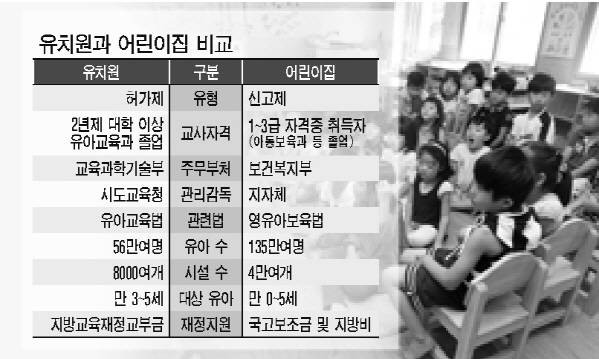 하지만 교육과정은 통합됐어도 행정체제는 여전히 분리돼 있다. 유치원은 교과부와 시·도교육청이, 어린이집은 보건복지부와 시·도 지자체가 각각 관리하고 있는 것. 예산도 지방교육재정교부금과 지방비 등으로 분리돼 있다.
