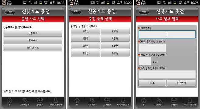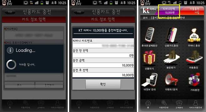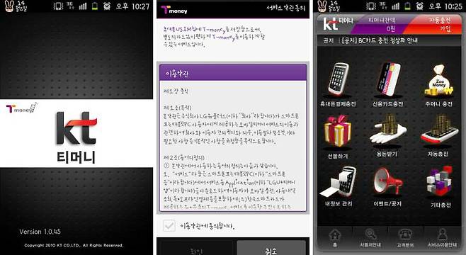 이 같은 확인 과정을 거쳤다면 본격적으로 앱 이용에 나서보자. 사용방법은 생각보다 간단하다. 가장 먼저 '마켓'에서 자신의 통신사에 맞는 모바일 티머니 앱을 내려 받은 후 이용약관에 동의한다. 이용약관 동의여부 과정이 끝나면 곧이어 메인화면이 열리는데, 메인화면은 '휴대폰결제충전' '신용카드충전' '주머니 충전' '선물하기' '용돈 받기' '자동충전' '내 정보관리' '이벤트/공지' '기타충전' 탭으로 구성돼 있다.