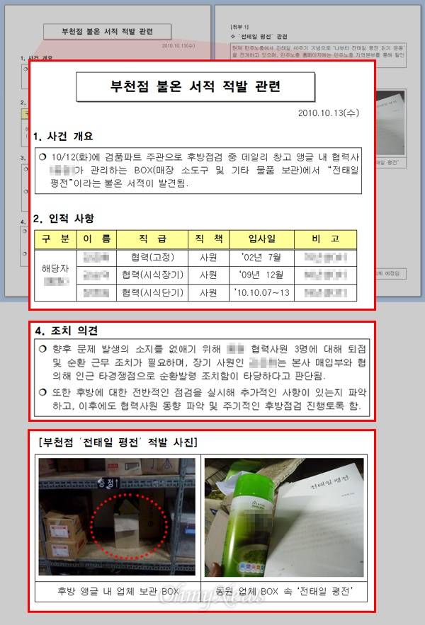 이 정도 되면 한 사기업의 인사노무 관리가 아니라 사실상 사찰에 가깝다. 2010년 10월 13일 작성된 '부천점 불온 서적 적발 관련'이라는 제목의 이마트 내부 문서는 그 정점을 보여준다. 문서는 전날인 12일 후방 점검 중에 "협력사에서 관리하는 박스(매장 소도구 및 기사 물품 보관)에서 < 전태일 평전 > 이라는 불온 서적이 발견"됐다는 내용으로 시작했다.