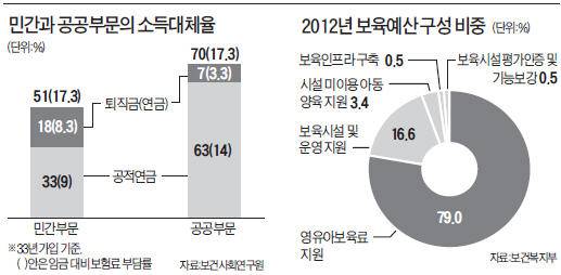 보사연은 우선 보험료 납입자가 일할 때 받는 임금 대비 나중에 받는 연금의 비율인 소득대체율을 문제삼았다. 33년 가입, 소득 대비 보험료 부담률 17.3%를 기준으로 할 때 소득대체율은 공공 부문 근로자가 70%인 데 비해 민간 부문 근로자는 51%에 불과하다는 것이다. 이는 공적연금에 퇴직연금을 포함한 수치다. 보고서는 "공무원연금공단 측은 민간에 비해 퇴직금이 적고, 보험료율(14%)은 높아 소득대체율이 높은 것이 당연하다고 주장하지만 이를 모두 감안해도 20%포인트 가까운 격차가 난다"고 지적했다.