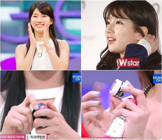 온스타일 '유진의 겟잇뷰티'에서 자신의 파우치를 공개했다. 평소 수지의 청초한 얼굴을 부러워했던 여성들은 그녀의 파우치에 무한한 관심을 보였다. 얼굴을 촉촉하게 만들어주는 미스트와 함께 생기를 불어 넣어주는 색조 아이템이 눈에 띄었다.