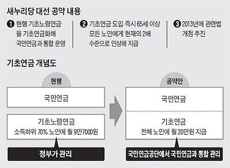 새누리당은 지난 대선에서 현행 기초노령연금을 기초연금으로 바꾸어 국민연금과 통합 운영하면서 65세 이상 모든 노인에게 현재의 2배인 20만원을 지급하겠다고 공약했다. 현재는 소득 하위 70% 노인에게만 월 9만7000원을 주고 있다.