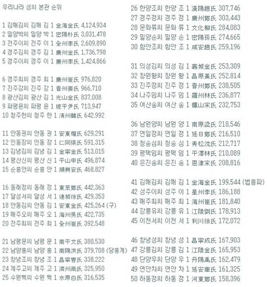 우리나라 성씨 본관 순위, 김해김씨 약 400만명 '압도적 1위'