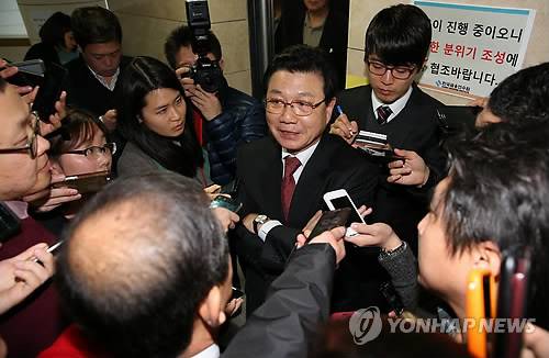 (서울 인수위사진기자단=연합뉴스) 김진선 대통령취임준비위원장이 20일 서울 삼청동 한국금융연수원 내 대통령직 인수위원회에서 취임식 준비에 대해 브리핑한 뒤 취재진의 질문을 받고 있다. 2013.1.20