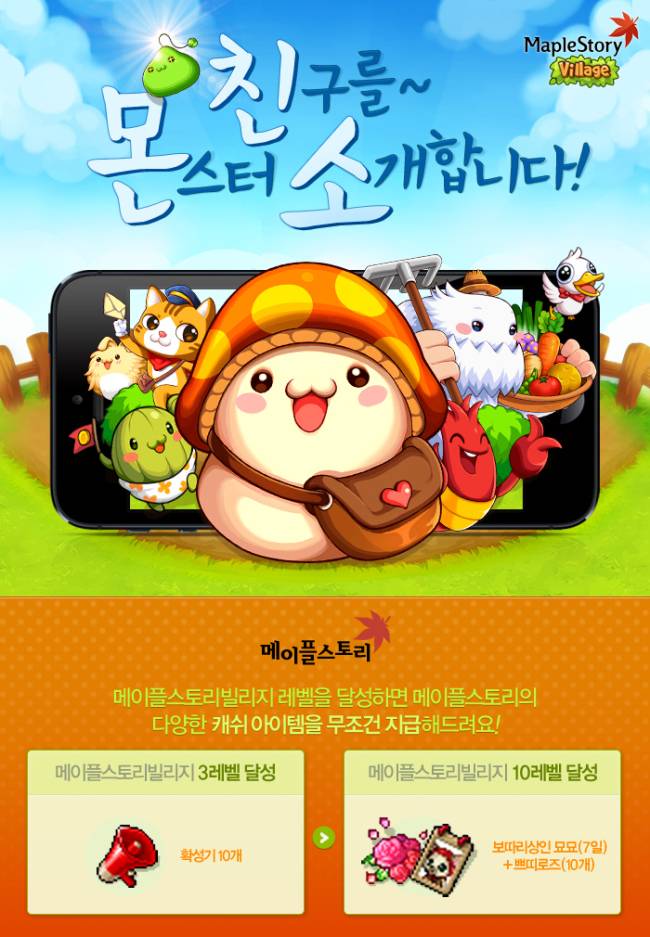 또한, '메이플스토리 빌리지'에 가입해 미션을 완료한 '메이플스토리' 유저에게는 '확성기'와 '보따리상인 묘묘', '쁘띠로즈' 등 다양한 게임 아이템이 선물로 제공된다.